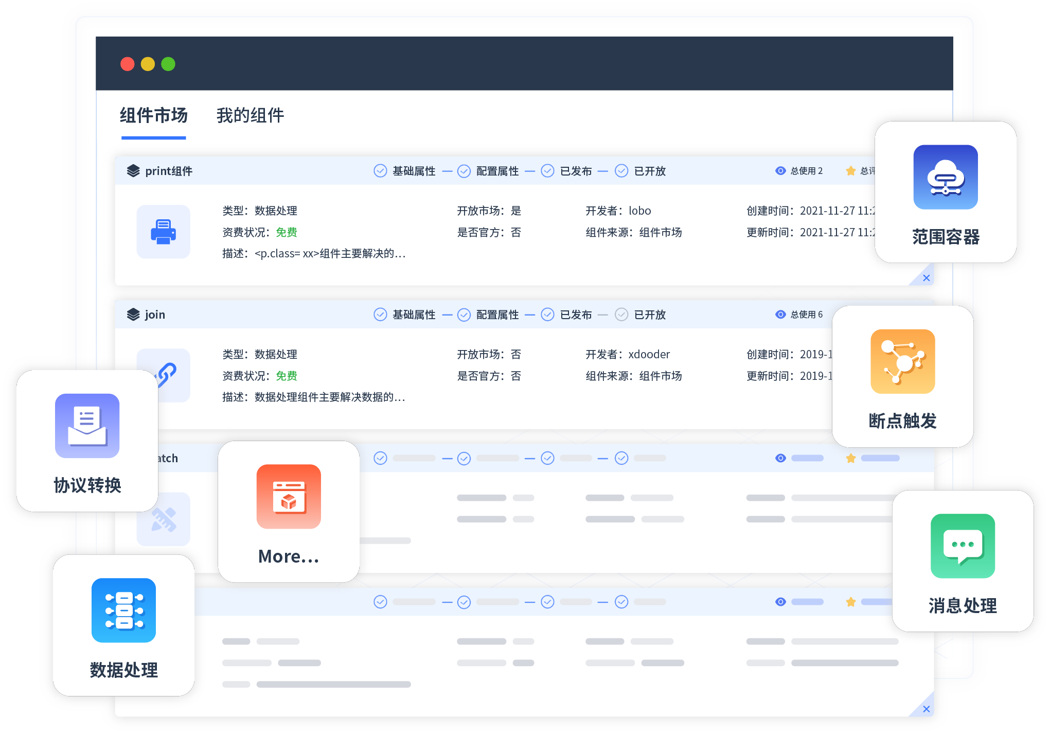 针对集成场景,公海gh555000aa提供组件市场,例如协议转换、消息处理、文件操作等。除平台提供的组件外,客户可以自定义所需组件。